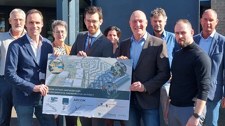 Persbericht: Op vrijdag 24 maart 2023 ondertekenden gemeente Urk, HEVO en Arcom architectuur uit Veenendaal in combinatie met 1:1 Architectuur uit Urk een overeenkomst voor het ontwerp van de brede school in de Zeeheldenwijk.
