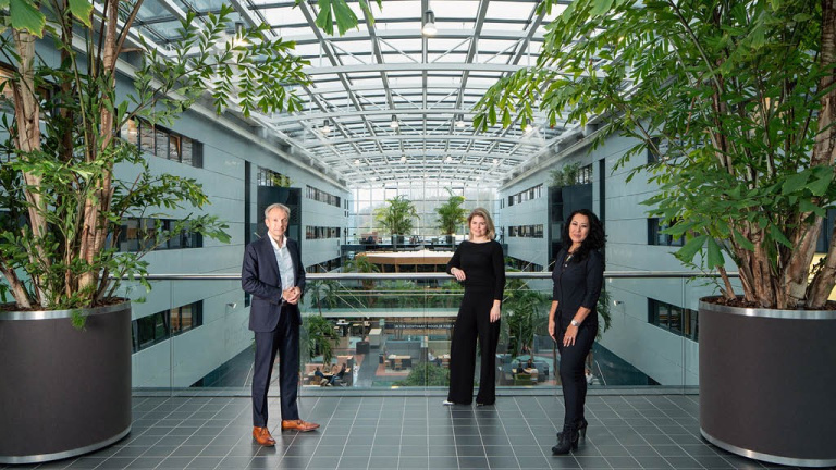 Van links naar rechts: Michiel Otto, directeur HEVO, Annejet Lieshout, manager Gebouwen, Services en Infrastructuur GSI en Christine Roest, assistent portfolio manager GSI