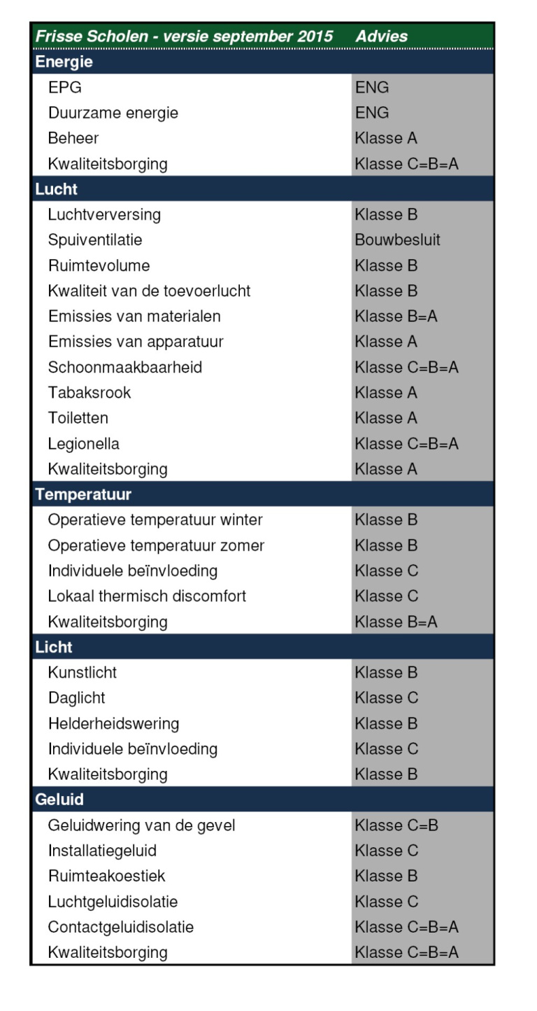 Frisse Scholen; u heeft ongetwijfeld van dit RVO-programma gehoord. Doel is om met dit programma te komen tot een goed binnenklimaat met een laag energieverbruik. Bijkomend voordeel van een Frisse School is dat een goed binnenklimaat wezenlijk bijdraagt aan een optimaal leerklimaat. En is een zeven dan voldoende of ga je voor een tien? Deze vragen krijgen de adviseurs van HEVO steeds vaker. Overheden en besturen willen bij nieuwbouw graag een helder antwoord op deze vragen. Daarom ontwikkelde HEVO vanuit haar eigen expertise en ervaring een duidelijke en objectieve kwaliteitsstandaard. Daarbij is als doel gesteld: de optimale balans tussen prijs en kwaliteit. Deze kwaliteitsstandaard helpt bestuurders en gemeenten om een heldere keuze te maken ten aanzien van kwaliteit, energiezuinigheid, duurzaamheid en kosten. Het maakt per Frisse Scholen-thema een afweging over welk ambitieniveau optimaal is en vormt daarmee een vertrekpunt voor het Programma van Eisen en/of prestatieafspraken. Daarnaast is inzichtelijk welk GPR Gebouw-niveau haalbaar is. Duurzaamheid wordt hiermee een meetbare entiteit.