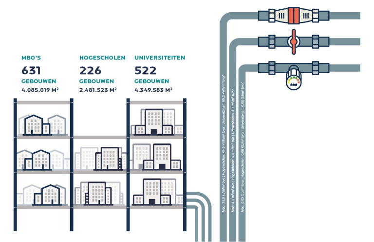 Mbo: 0,03 GJ/m² bvo | Hogescholen: 0,06 GJ/m² bvo | Universiteiten: 0,08 GJ/m² bvo*