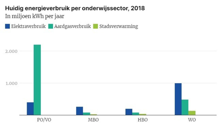 Verder wordt in het funderend onderwijs veel gas verbruikt, terwijl in het hoger onderwijs al meer gebruik wordt gemaakt van alternatieve warmtebronnen. Uit de Herijking Sectorale Routekaarten mbo en hbo uit 2020 blijkt dat 5 procent van de mbo-scholen stadsverwarming heeft als hoofdbron. Bij hbo is dat al 28 procent. ‘Wij denken dat dit komt omdat hbo-opleidingen relatief vaker in grotere steden staan’, zegt Gerhard Jacobs, partner bij adviesbureau HEVO. ‘Daar zul je sneller een systeem met stadsverwarming aantreffen. Mbo’s staan meer verspreid door het land, ook in kleinere gemeenten waar deze voorzieningen nog minder ontwikkeld zijn.’