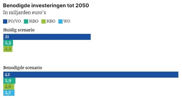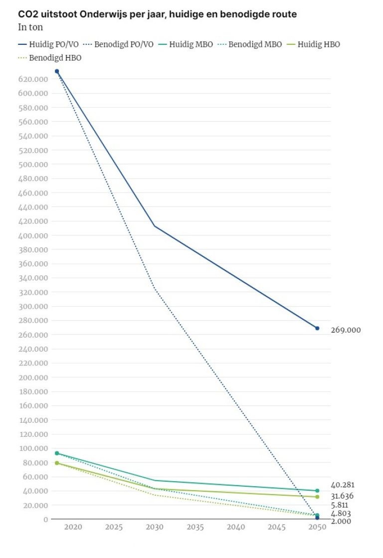 Vooral het funderend onderwijs (primair en voortgezet onderwijs) gaat daar een harde dobber aan hebben. De 7.900 scholen in het primair onderwijs en 1.420 in het voortgezet onderwijs stoten bij elkaar 635.000 ton CO2 uit per jaar. Maar het is zeker niet alleen het funderend onderwijs dat voor een torenhoge opdracht staat. Alle onderwijssectoren moeten er een paar stappen bij doen als ze in 2050 naar het gewenste doel willen. Bij het huidige tempo van verduurzaming zou niemand de doelstellingen halen, zo voorspellen de modellen.