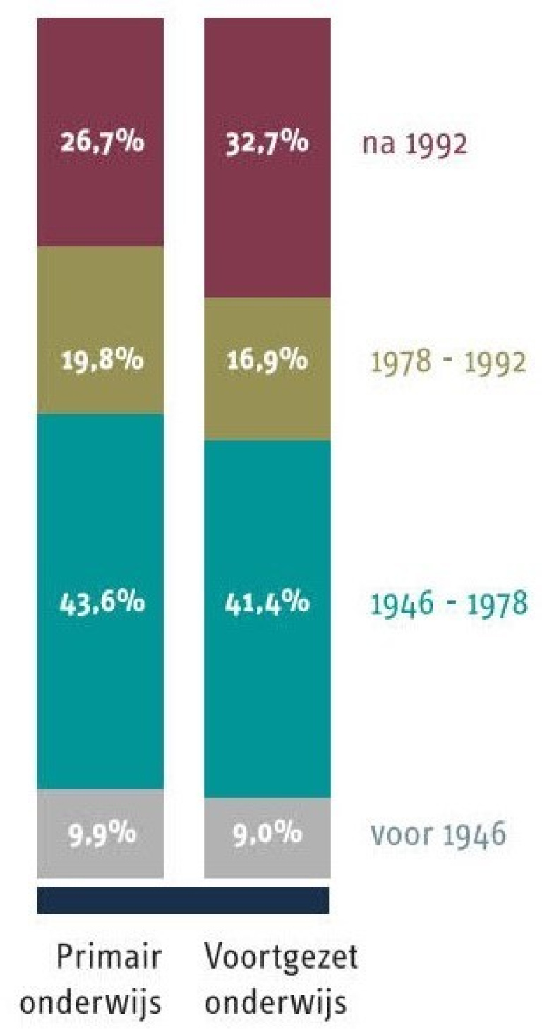Deze gebouwen zijn daarmee ruimschoots ouder dan 40 jaar: de leeftijd die in de regel gezien wordt als ‘het einde’ van de economische en technische levensduur van een schoolgebouw. Gemiddeld worden schoolgebouwen in Nederland echter pas op het 69e levensjaar vervangen. Met de huidige jaarlijkse vervangingsgraad (circa 1,33%) duurt het nog circa 30 jaar voordat alleen de gebouwen uit de periode 1946-1978 vervangen zijn.