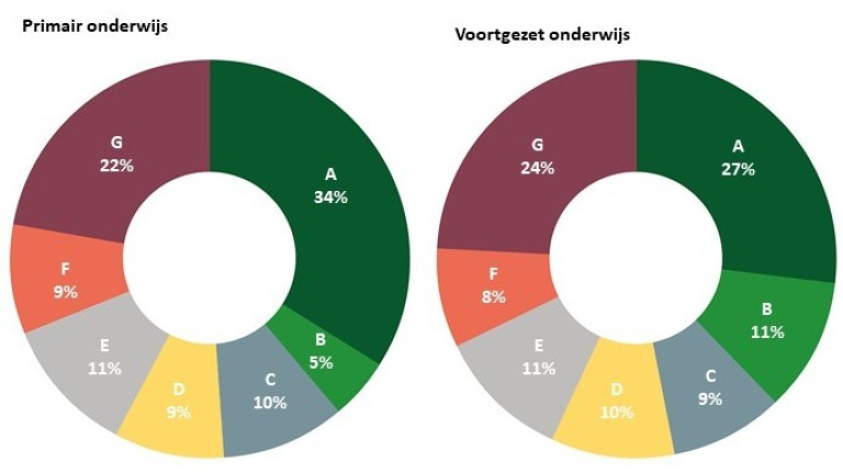 Het EIB heeft de resultaten daarom geëxtrapoleerd naar de gehele voorraad. Figuur 2 geeft deze resultaten weer. Hieruit blijkt dat meer dan de helft van de scholen in het PO en het VO een label heeft dat lager is dan energielabel C. Omgerekend naar het aantal gebouwen komt dat neer op ruim 5.000 schoolgebouwen die lager scoren dan energielabel C.