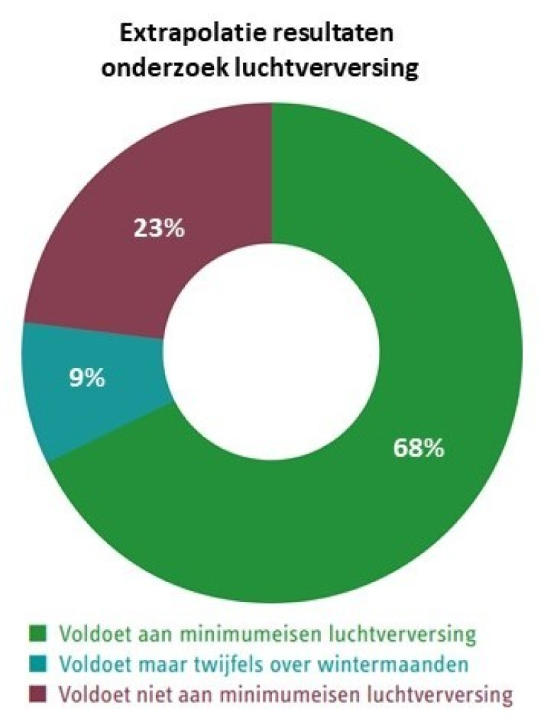 In circa 32% van de schoolgebouwen (zie figuur 3) voldoet het binnenmilieu niet of twijfelachtig aan de minimumeisen. In absolute aantallen zijn dat circa 3.000 schoolgebouwen. Het belang van goede ventilatie wordt al voor langere tijd door tal van wetenschappelijke onderzoeken aangetoond: het leerrendement kan in de gunstigste gevallen met 25% (!) omhoog en ook het ziekteverzuim gaat omlaag wanneer het binnenmilieu op orde is.