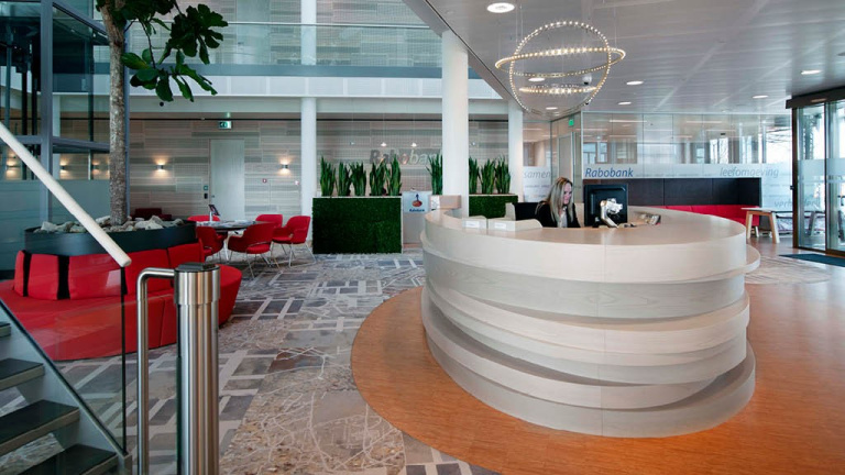 Boterblom: ‘Het moeilijkste aspect van de operatie was de politieke besluitvorming en het aankoopproces van het pand. Aanvankelijk zou de gemeente één verdieping van 1.000 m² huren in het gebouw, maar de Rabobank ging vervolgens inkrimpen. Uiteindelijk heeft de gemeente het kantoor gekocht en gebruikt de bank nog maar 110 van de 3.600 m². Maar het was lang onduidelijk hoeveel werkplekken we konden inrichten in het kantoor. Het definitieve koopbesluit viel in maart 2018; er waren toen nog negen maanden voor de verbouwing en verhuizing, inclusief de voorbereidingen. Bij die voorbereidingen hoorde ook het creëren van een nieuwe plek voor de Rabobank. Die maakt met ongeveer twintig medewerkers nog gebruik van het gebouw. Ze hebben een eigen werkruimte, maar delen met ons de entree, vergaderkamers, het sanitair en het bedrijfsrestaurant.’ Van der Werf: ‘Omdat het pand nog jong is en daardoor past bij de eisen van deze tijd en bovendien een hoog afwerkingsniveau heeft, bleef het bedrag van de verbouwing ruim onder de drempel waarboven we Europees hadden moeten aanbesteden. We konden daardoor de aannemer inschakelen die dit pand zeven jaar geleden heeft gebouwd. Hij had de vereiste lokale betrokkenheid en flexibiliteit om dit in een recordtijd voor elkaar te krijgen.’