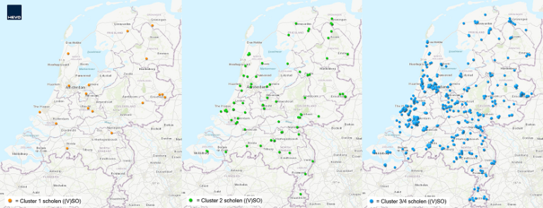 Voor de cluster 2- en cluster 3/4-scholen is de spreiding over het land optimaler verdeeld. Voor beide typen scholen geldt dat leerlingen in het westen en midden van Nederland aanzienlijk meer ‘thuisnabij’ gebruik kunnen maken van het onderwijs waar behoefte aan is dan leerlingen in het noorden en oosten. Niet vreemd dat de dichtheid aan scholen het hoogst is in dichtbevolkte gebieden, echter neemt dat niet weg dat de grovere spreiding veel vraagt van de reisbereidheid van leerlingen en ouders.