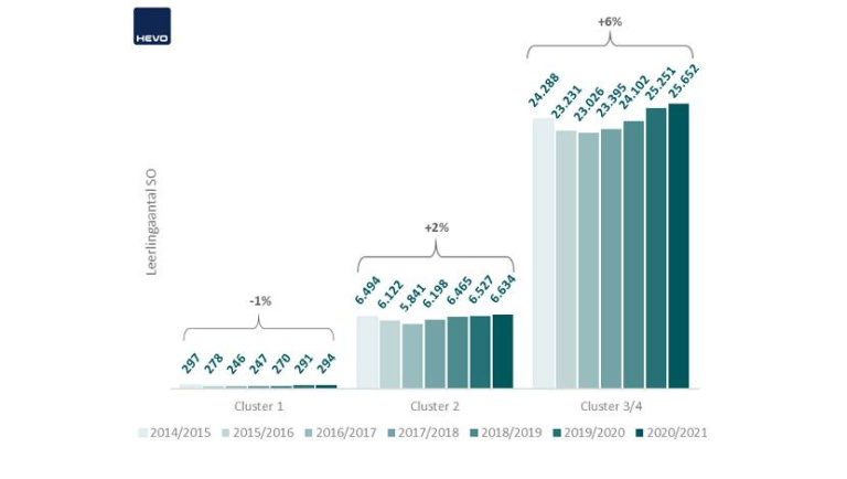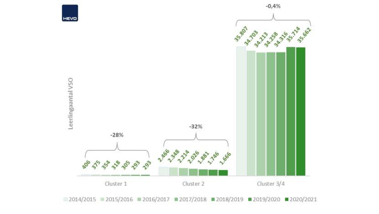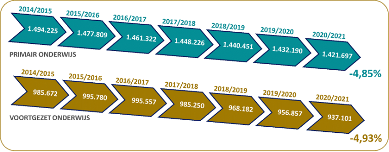 Nog steeds zien we een dalende trend van het aantal leerlingen op het regulier onderwijs. Sinds het schooljaar 2014/2015 gaat het voor het primair onderwijs (PO) om een daling van 4,85%. In het voortgezet onderwijs (VO) betreft het sinds 2014/2015 een daling van 4,93% (HEVO, 2020). Met name het VO laat hier in het huidige schooljaar een forse daling in het aantal leerlingen zien.