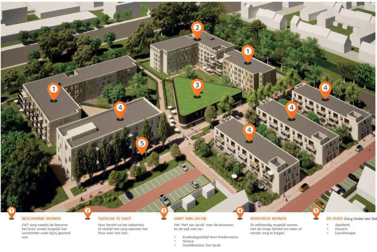De komende tijd worden de resterende gebouwen van Hof van Jacob gebouwd. In het centrale gebouw het ‘Hart van Jacob’ komen een vestiging van Hero Kindercentra, een horecagelegenheid en het nieuwe hoofdkantoor van Sint Jacob. Daarnaast worden er c.a. 90 huurwoningen gerealiseerd voor de sociale huur en middensegment. Onder het gebouw met de sociale huurwoningen wordt een ZOED gerealiseerd die onderdak biedt aan o.a. een huisarts, fysiotherapeut en apotheek.