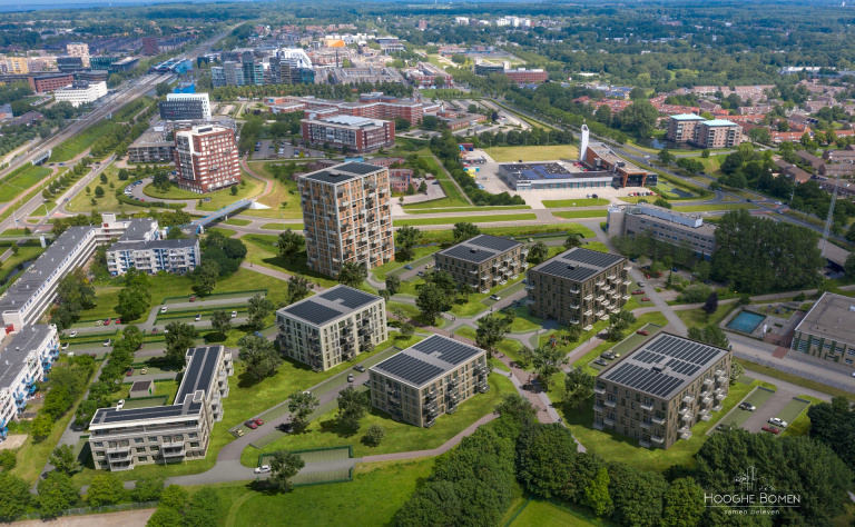 De 6 woongebouwen staan om een centraal autovrij binnen gebied waar ruimte is voor veel groen, spelen en ontmoeten met zitjes langs de brede looproute die de gebouwen verbindt. In een van de gebouwen huist Buurtkamer De Hooghe Bomen, een inlooppunt voor de buurt georganiseerd in samenwerking met Welzijn Lelystad. In de woongebouwen zit een brede mix aan woningen: van studio tot een 4-kamerwoning, voor jong en oud. Er waren veel enthousiaste reacties van bewoners die aanwezig waren en er al met plezier wonen.