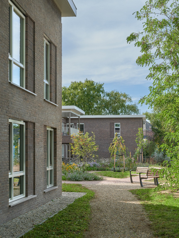In het terrein zit een hoogteverschil van circa 2 meter die ook weer terug te zien is n het gebouw volume; het gebouw “beweegt” mee omhoog richting de Elzenstraat waarbij de twee bouwlagen ieder gelijkvloers blijven. De centrale entree met klein hoogteaccent ligt als overgang tussen het lagere en hogere volume. Qua volume en positionering refereert het gebouw aan de voormalige school. In de ritmering van ramen wordt het karakter van een woongebouw benadrukt. Er is aansluiting gezocht met de tuindorp architectuur van de Bomenbuurt door in de keuze voor metselwerk met verbijzonderingen daarin in de gevel gecombineerd met bijna witte kozijnen en een nadrukkelijk sterke horizontale dakrand als gevelbeëindiging. Het doel is om een woongebouw te realiseren waar mensen met een intensieve zorgvraag op een prettige manier kunnen wonen en professionele zorg kunnen ontvangen.