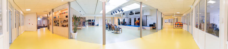 In het nieuwe gebouw is een ruime en lichte centrale hal gesitueerd waar naast werken ook speciale activiteiten kunnen plaatsvinden zoals vieringen, presentaties, vergaderingen en keuzecursussen.De lokalen zijn ingericht voor wereldoriëntatie met voldoende computers zodat een hele stamgroep hier kan werken. De interne begeleiding, de directie en de administratie hebben ieder een eigen ruimte.De koffiehoek van de leerkrachten heeft een open karakter en is daardoor zeer toegankelijk voor kinderen en ouders. Deze openheid is typerend voor het kindcentrum.