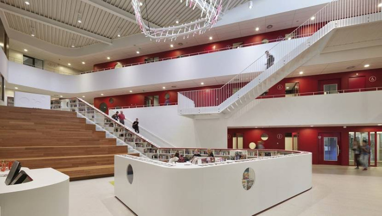 Uitnodigende en stimulerende leeromgeving met diverse ruimten om elkaar te ontmoeten en samen te leren.