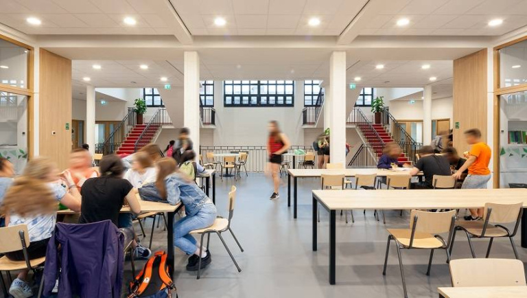 Het monumentale pand werd getransformeerd in een leeromgeving voor 4-18 jaar met veel licht, lucht en transparantie, zonder dat de oorspronkelijke architectonische kwaliteit werd aangetast.